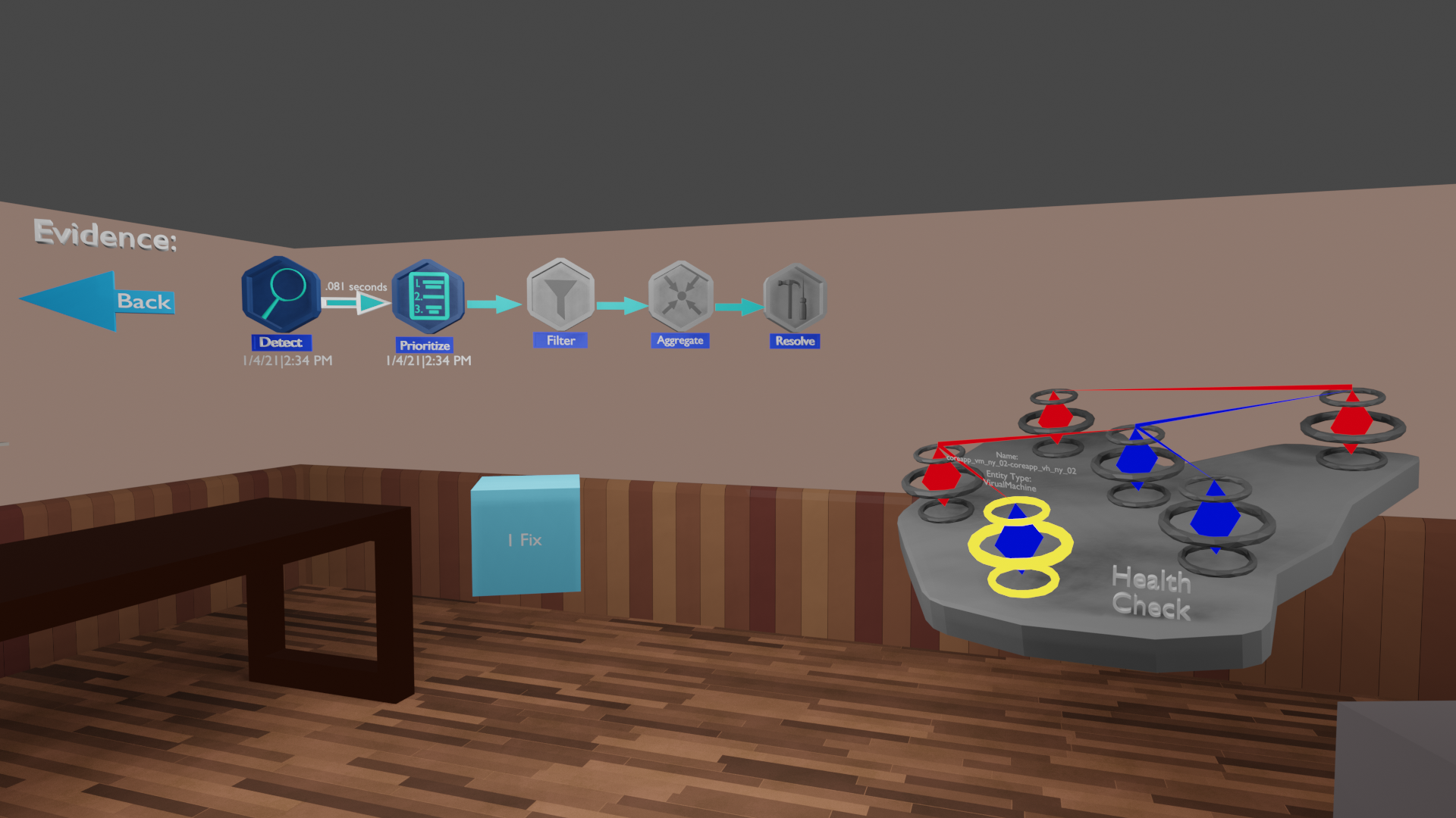 I mapped out potential interaction models using wireframes and mockups, then brought them to life in Blender and Unity. The environment allowed users to walk through a room-sized network, filter by node type, and highlight system alerts in real time.
